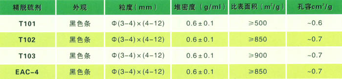 产品简介: T101、T102、T103型系列精脱硫剂,系以优质活性炭为载体,浸渍活性组份及特种添加剂,经干燥、焙烧制成高效气相常温精脱硫剂。该系列产品已通过原化工部主持的专家鉴定,认为该精脱硫剂脱硫精高度(H2S脱至≤0.03ppm),工作疏容大、强度好、价格低、属国际领先水平,并被原化工部化肥催化剂标准化技术归口单位正式命名为T101、T102、T103型精脱硫剂。EAC-4型不仅有很高的精脱H2S,同时在常温下有较高的精脱SO2(≤0.05ppm)的能力。 产品用途: 主要用于合成氨、甲醇、联醇、甲烷化、醇烃化、合成燃料、食品级CO2、变压吸附、双氧水、精细C1化工等生产工艺中精脱硫化氢。也可用于天然气、城市煤气、焦炉气、沼气、废气等气体中H2S的精脱。 技术指标: